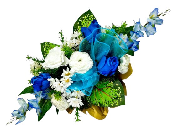 BIAŁO NIEBIESKI STROIK NA CMENTARZ KWIATY NA GRÓB POMNIK + OBCIĄŻENIE
