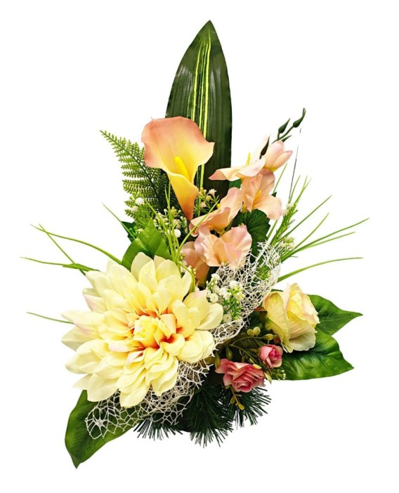 Stroik cechuje się unikalną kompozycją sztucznych kwiatów. Starannie dobrane kwiaty są niezwykle realistyczne, dodając wiązance autentyczności i podkreślając jej uroczysty charakter. Ten produkt jest idealny jako element dekoracji grobu, łącząc szacunek i elegancję w jednym, starannie wykonanym projekcie.