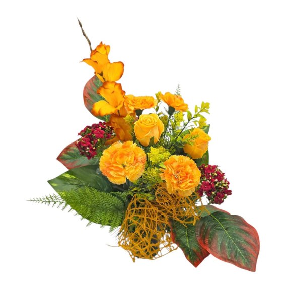 💚Stroik cechuje się unikalną kompozycją sztucznych kwiatów. Starannie dobrane kwiaty są niezwykle realistyczne, dodając wiązance autentyczności i podkreślając jej uroczysty charakter.