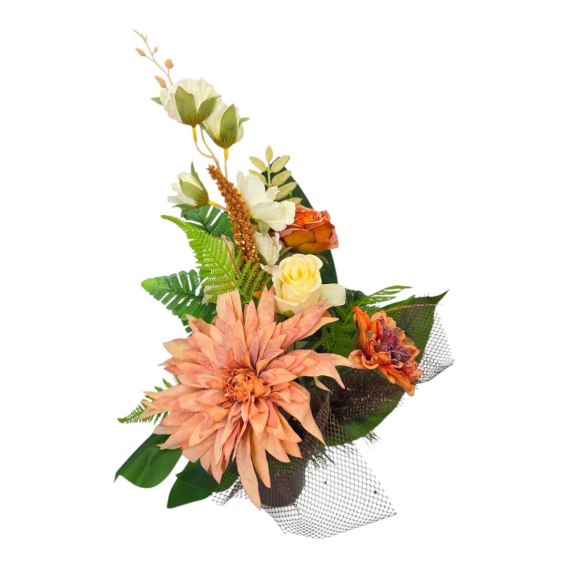 🔹Stroik cechuje się unikalną kompozycją sztucznych kwiatów. Starannie dobrane kwiaty są niezwykle realistyczne, dodając wiązance autentyczności i podkreślając jej uroczysty charakter🔹