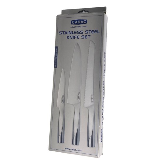 Zestaw noży ze stali nierdzewnej składa się z trzech podmiotów, mających różne zastosowanie w kuchni.Pierwszym nożem w zestawie jest nóż do obierania o długości 12 cm z gładką krawędzią. Jest to doskonałe narzędzie do precyzyjnego obierania różnych warzyw i owoców, ale może być również używane do innych drobnych aczkolwiek precyzyjnych prac. Dzięki niemu można łatwo usunąć żyłki z mięsa/ krewetek, wyjąć nasiona lub wykonać delikatne krojenia czy dekoracje.Kolejnym nożem w zestawie jest nóż szefa kuchni o długości 20 cm. Ten uniwersalny nóż jest niezastąpiony w każdej kuchni. Jego główne zastosowanie to między innymi krojenie, siekanie, krojenie w kostkę. Zakrzywione ostrze tego noża doskonale przylega do deski do krojenia, co zapewnia precyzje w każdym detalu.Trzecim nożem w zestawie jest ząbkowany nóż do chleba o długości 20 cm. Ząbkowane ostrza świetnie nadają się do krojenia chleba, bułek czy ciast. Ząbki na ostrzu ułatwiają przecinaniem chrupiącej skórki chleba, a także świetnie radzą sobie z wilgotnym wnętrzem.Cadac Set to niezastąpione narzędzia w każdej kuchni. Oferują one różne opcje cięcia i krojenia, idealne do różnych potraw i składników.Dzięki nim praca w kuchni staje się łatwiejsza, bardziej efektywna oraz znacznie przyjemniejsza.Parametry techniczne:Długość noża do obierania: 12 cmDługość noża szefa kuchni: 20 cmDługość noża do chleba: 20 cm
