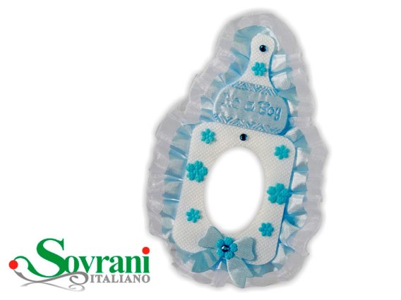 Niesamowicie urokliwa ozdoba chłopięcego pokoju. Wykonana z przyjemnego w dotyku materiału. przypomina w swym wyglądzie ramkę na zdjęcie. W środku umieszczono butelkę. którą ozdobiono licznymi. mniejszymi i większymi niebieskimi kwiatuszkami. Na górze butelki napis Its a boy. Na dole butelki kokarda przypięta połyskującym kamyczkiem. Idealny pomysł na prezent. zachwyci i dziecko. i rodziców.