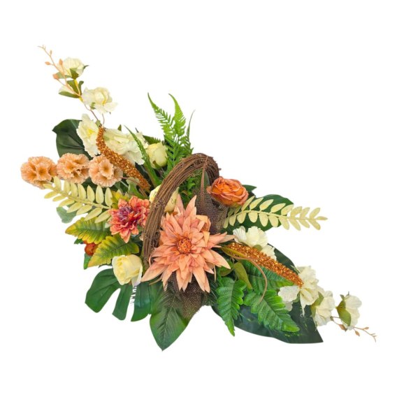 Stroik cechuje się unikalną kompozycją sztucznych kwiatów oraz innych dodatków. Starannie dobrane kwiaty są niezwykle realistyczne i naturalne, dodając wiązance autentyczności i podkreślając jej uroczysty charakter.