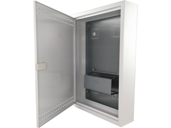 Szafka zaopatrzona w ażurową ściankę tylną umożliwiającą w dowolnym miejscu zainstalowanie urządzenia aktywnego bądź płytki montażowej.