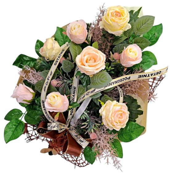 Kwiaty są integralnym elementem ceremonii ostatniego pożegnania lub jako element ozdobienia grobu, łącząc szacunek i elegancję w jednym, starannie wykonanym projekcie. Podkład wieńca jest wykonany z zielonych, gęsto splecionych gałązek PCV, które są zarówno trwałe, jak i estetyczne, podkreślając kolorystykę wiązanki.