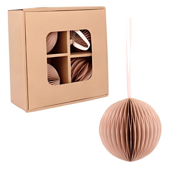 Zestaw zawiera 4 bombki o średnicy 7 cm, które doskonale sprawdzą się zarówno na choince, jak i w stroikach świątecznych. Dzięki wyjątkowemu materiałowi i delikatnej barwie, bombki z papieru dodają subtelności każdej świątecznej aranżacji.