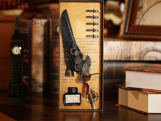 Zestaw piśmienniczy - Pióro czarne z kałamrzem, atramentem i 5 stalówkami