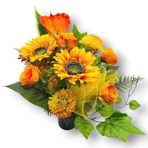 Bukiet na cmentarz z dobrej jakości sztucznych kwiatów idealnie ozdabia płytę nagrobną. Stworzony z dbałością o każdy szczegół. Niepowtarzalny i oryginalny bukiet na grób.