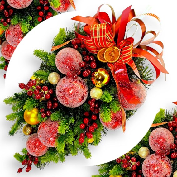 Przedstawiamy przepiękny Stroik Świąteczny - wyjątkową dekorację bożonarodzeniową, która wprowadzi świąteczną atmosferę w każdą przestrzeń! Wykonany z realistycznego igliwia, zdobiony eleganckimi bombkami, jarzębiną oraz kokardą. Całość uzupełniają starannie dobrane dodatki, które nadają stroikowi niepowtarzalnego uroku.