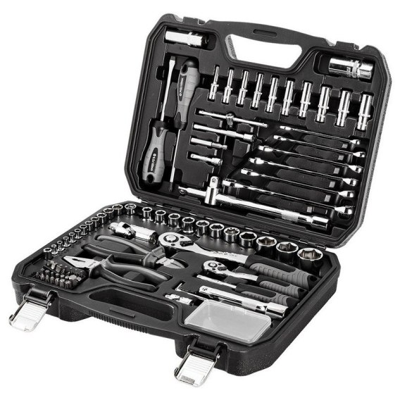 Ponadto w zestawie znajdują się klucze płasko-oczkowe, wkrętaki, szczypce, bity i pokrętła.